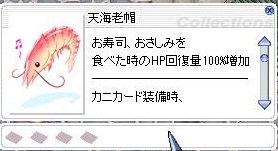 (あ、ちなみに天海老帽を装備していれば、海老20匹9000zで買えるそうです。)